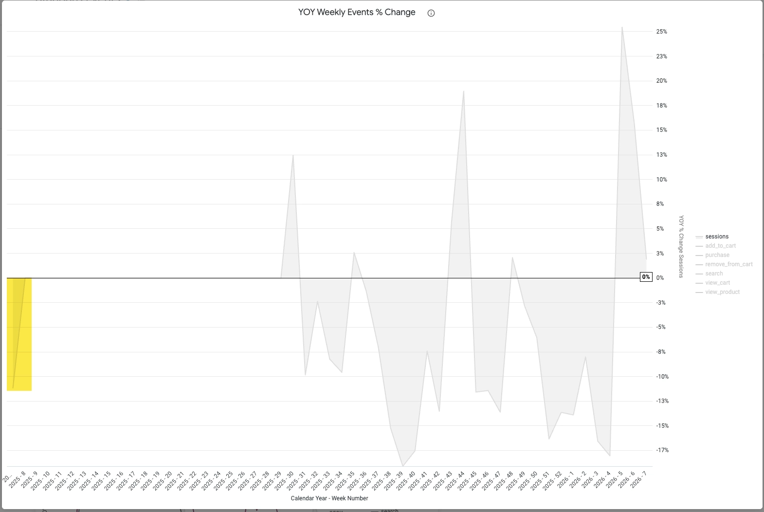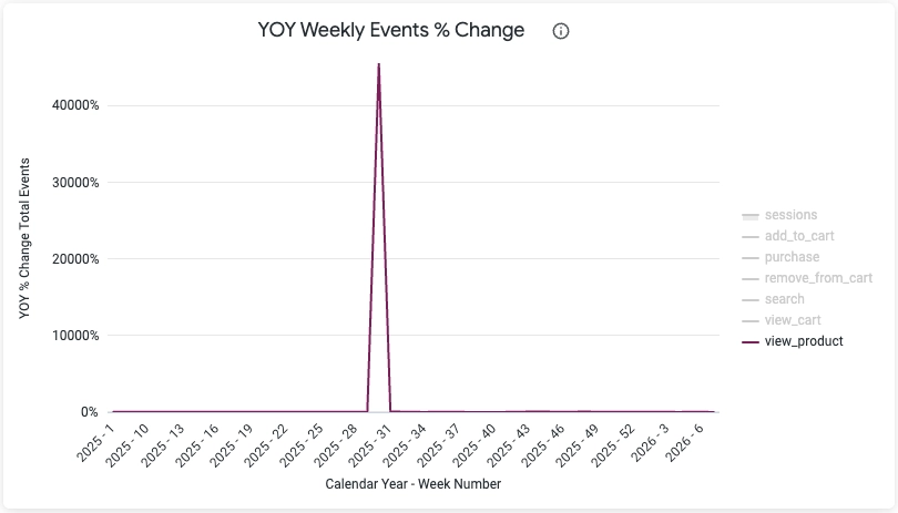 You may also see zero data in the YoY Weekly Events % Change chart for similar reasons. This chart compares each week in your selected date range to the same week in the prior year. If no events exist in the prior year, the percent change value is zero.