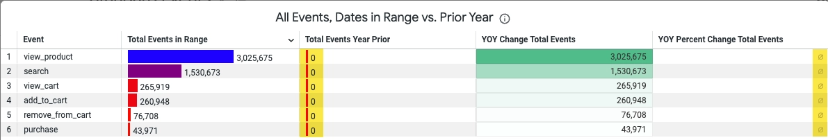 For example, the below chart shows zero value in the Total Events Year Prior and YoY Percent Change Total Events columns.